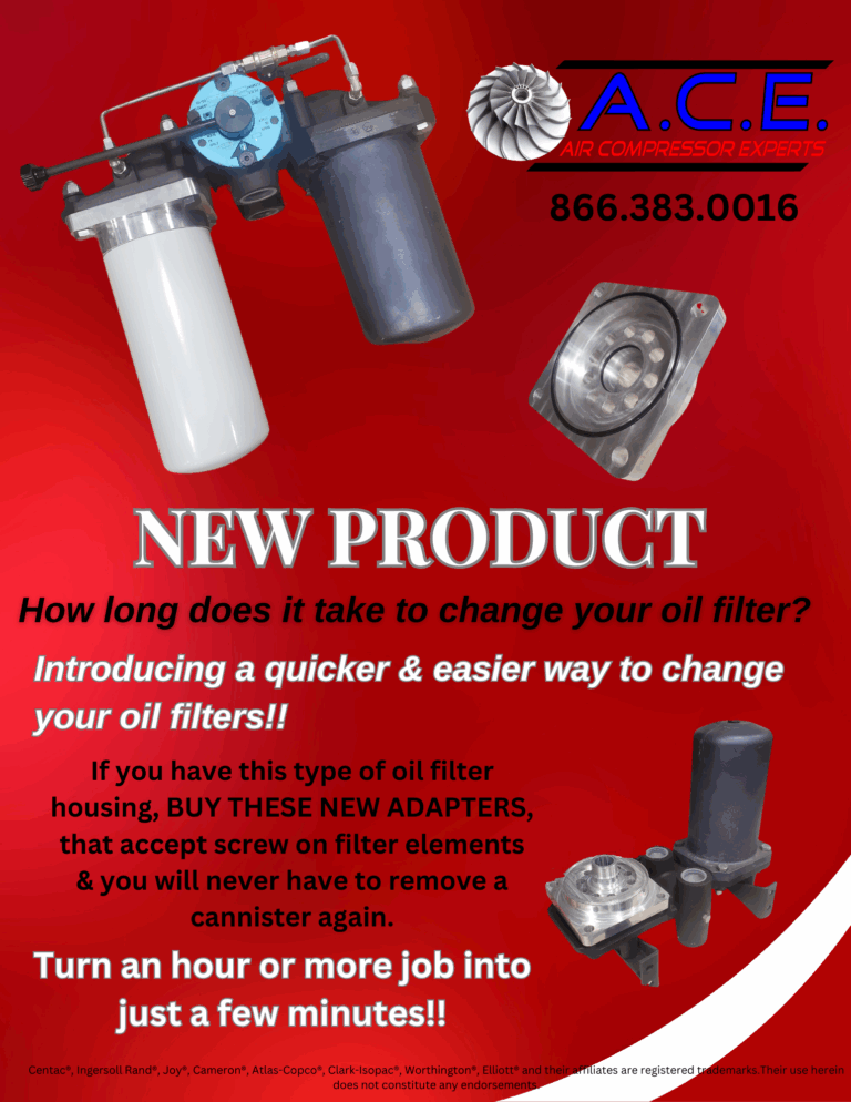 ACE introduces new adapters for a quicker and easier way to change oil filters. If you have this type of oil filter housing, BUY THESE NEW ADAPTERS, that accept screw on filter elements and you will never have to remove a cannister again. Turn an hour or more job into